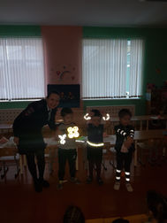 Она рассказала ребятишкам о световозвращающих элементах, о необходимости носить их в темное время суток. также она продемонстрировала то, ка они светятся в темноте.